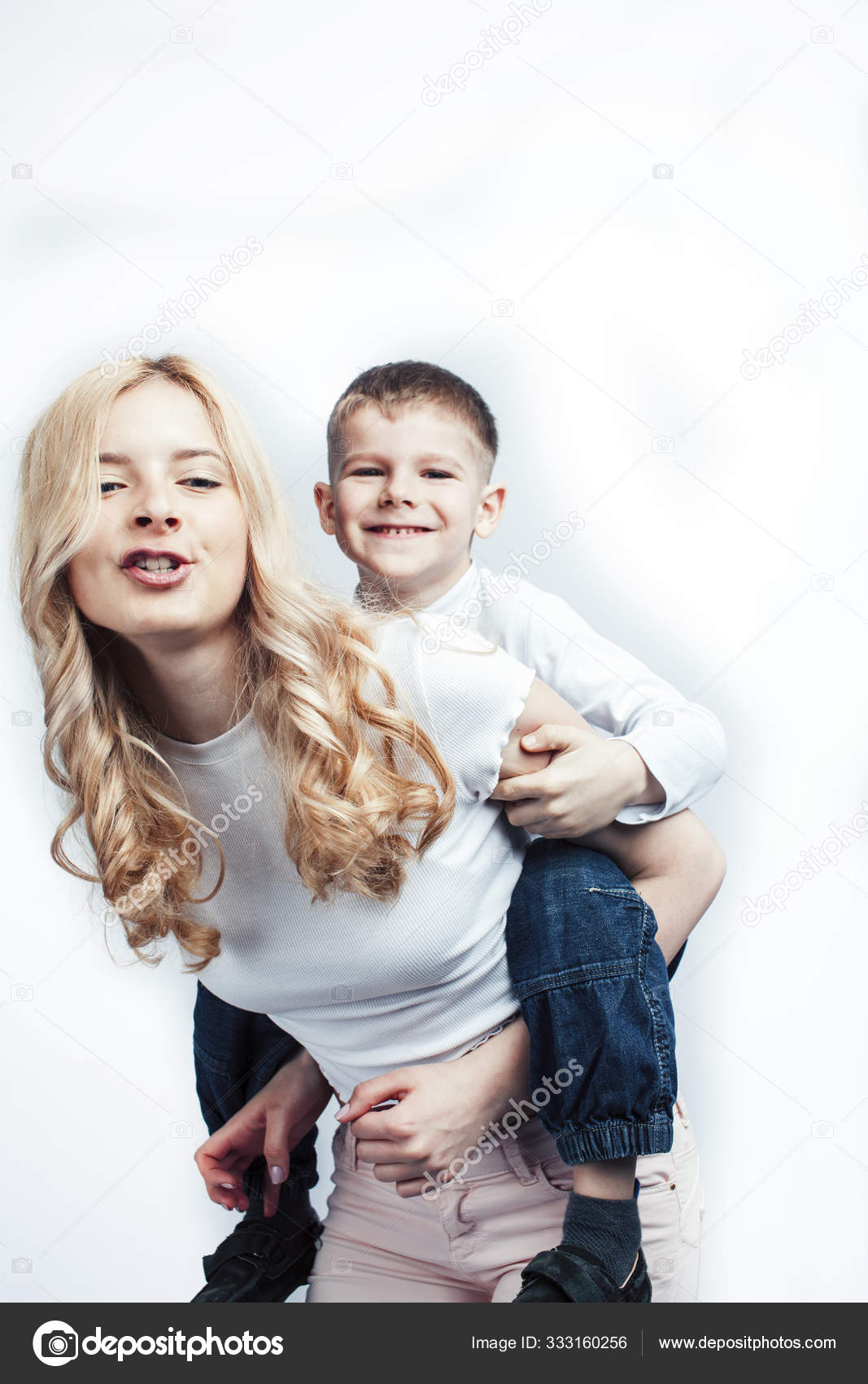 Muda Modern Rambut Pirang Ibu Keriting Dengan Anak Yang Lucu Bersama Sama Bahagia Tersenyum Keluarga Berpose Ceria Di Latar Belakang Putih Gaya Hidup Orang Konsep Adik Dan Saudara Teman Teman Stok Foto C